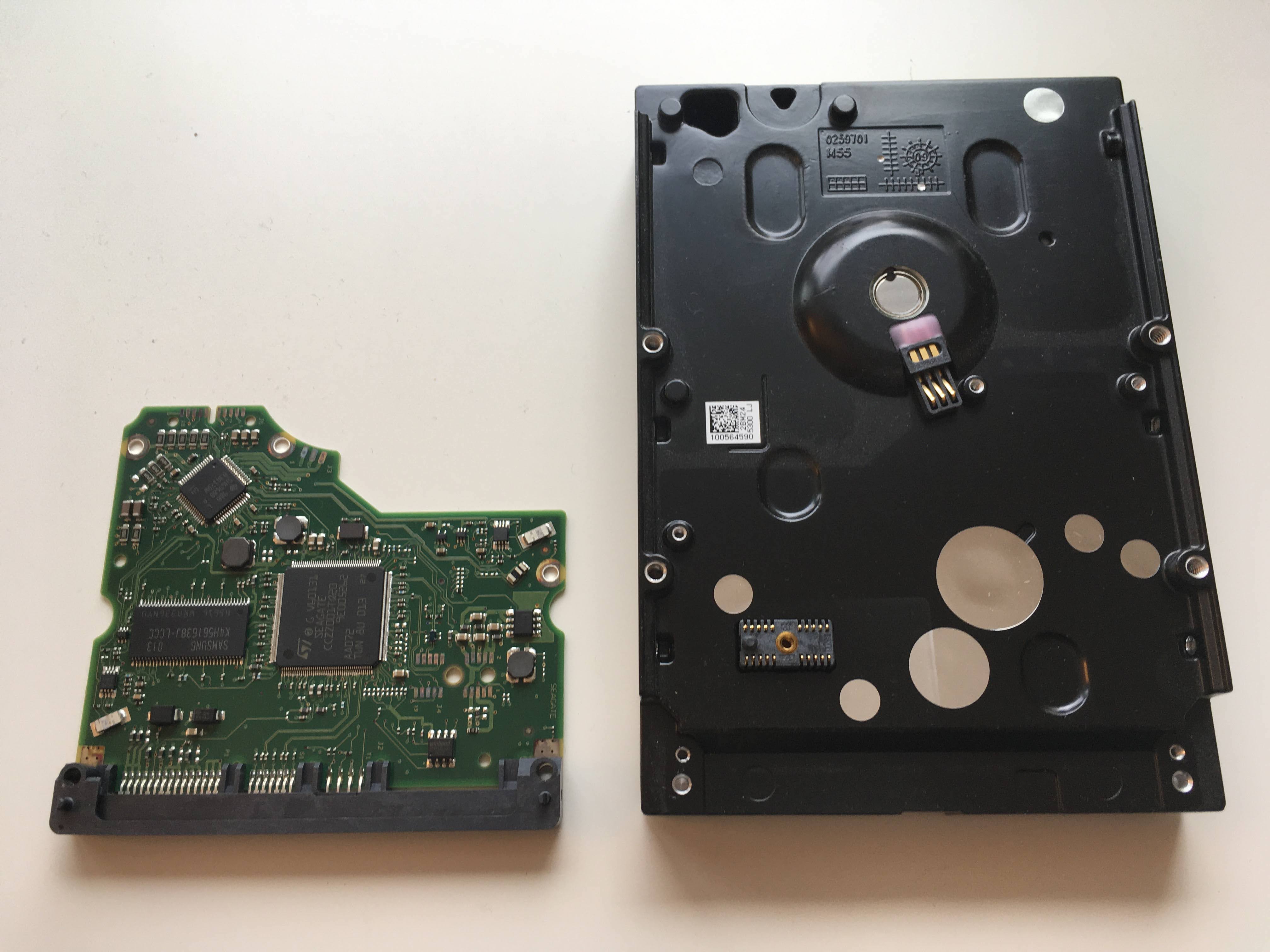 The logic board was connected to the rest of the hard drive with just some screws. It came off pretty easily. The only electrical connection between the logic board and the box with the platters in it was that little black and gold thing in the bottom-left of the platter enclosure. The contacts were all touch-contacts. There was no solder holding the logic board to the box holding the platters. You can see the logic board's contacts if you look just to the left of the large square integrated circuit in the middle of it.