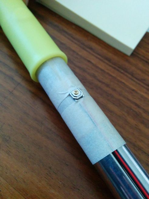 Since I measured a non-zero resistance when the button was depressed, and the resistance changed when I depressed the button, it seemed like the stick should have been working just fine. When I pulled the rubber handle up to examine the pushbutton, I saw that the terminals of the button were exposed solder, and they were able to contact the metal frame of the selfie stick. My theory is that the switch was sometimes shorted out when it wasn't supposed to be, so the phone identified it as malfunctioning and ignored all commands from it.