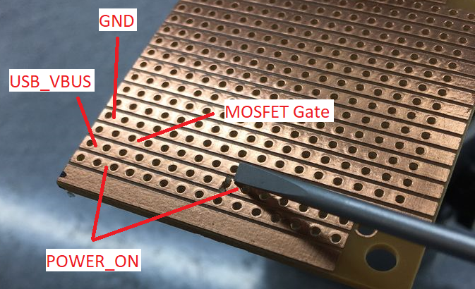 And I made a solder bridge between two strips to connect the drain of the MOSFET to the wire going to the POWER_ON test point connection.