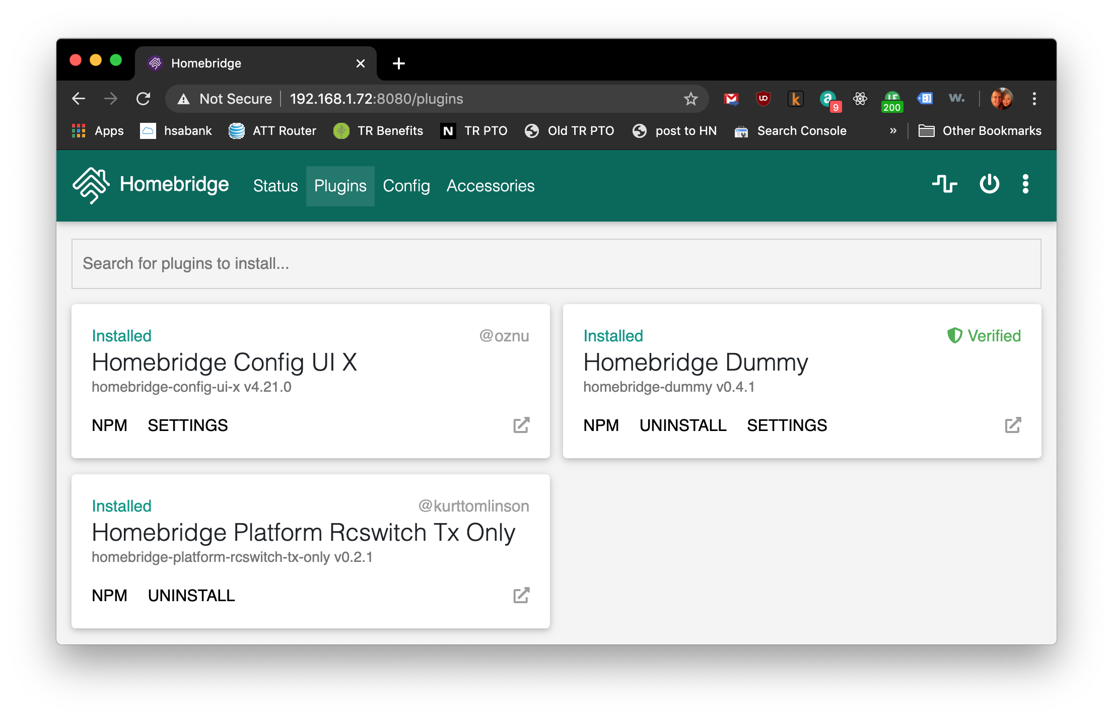 Then install the homebridge-dummy and homebridge-platform-rcswitch-tx-only plugins. You can do that from the Homebridge web interface by clicking "Plugins" at the top of the page, searching for those plugins by name, and clicking "install" for each of them. Here's what your plguins page should look like after you've installed them:
