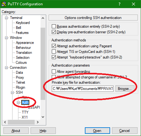 In PuTTY, you can add your private key to your saved Raspberry Pi profile by adding the private key. (Ignore the ₩ symbols in the file's path. My PC's region is set to Korea to support certain non-Unicode-aware Korean programs. This causes issues with how the backslash character is displayed in some programs because of some reasons that I'd rather not explain right now.)