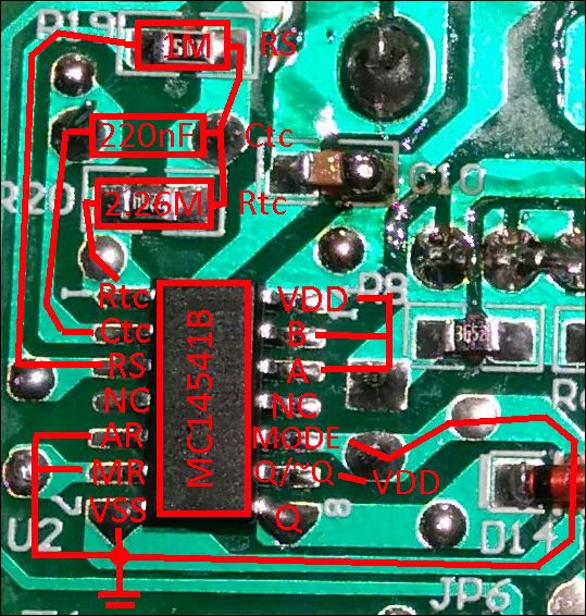 So how could I modify the circuit in an easily reversible way so that the blanket would never turn off? Well, if I short RS, the counter's input, to VDD or VSS, then the counter would never increment. This is safe because the resistors RS and Rtc limit the current drawn from the chip, and the input current of RS is certainly less than the current headroom of the blanket's power supply.