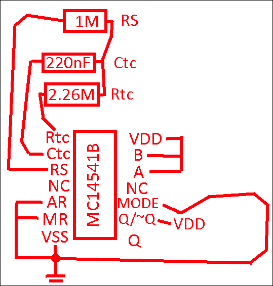 Pins A and B are high, so that means the counter will count to 2^16 (or 65536). Rtc is 2.26 MΩ and Ctc is 220 nF. Using the formula on page 6 of the data sheet, I calculated the counter's frequency.