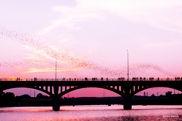 The Congress St bridge is home to millions of bats in the summer. In the winter, these bats migrate to Mexico. The bats eat lots of insects like mosquitoes and keep the Town Lake an enjoyable place to be. The bats start leaving the bridge before sunset and slowly stream out for hours.